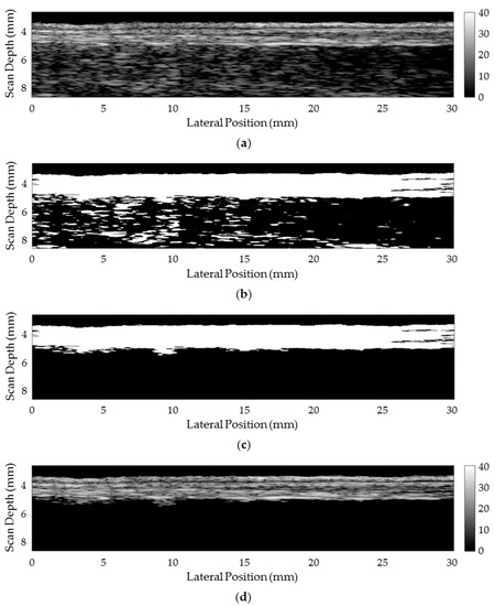 A key component in successful characterization of the mucosa/submucosa in vivo using the approach proposed here is the ability to separate the region of interest (ROI) digitally from the surrounding tissue in the µUS scans. A custom software algorithm was developed in MATLAB (The Mathworks, Cambridge, UK) to isolate the data from the ROI for subsequent processing. This algorithm takes the original data from each B-scan, Figure 2a, and separates it into echoes with amplitudes above and below an empirical threshold of −26 dB with respect to the brightest echo. The resulting binary mask, Figure 2b, is cleaned up by applying a closing operation and the largest echo region is selected as the ROI, Figure 2c. The mask is then applied to the original data to remove the echo data outside the ROI, Figure 2d. BSC and Z are then calculated for this segmented data.