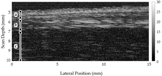 48 MHz microultrasound scan of ex vivo porcine esophageal tissue. Tissues layers can be distinguished as (a) mucosa, (b) submucosa and (c) muscularis propria and serosa.