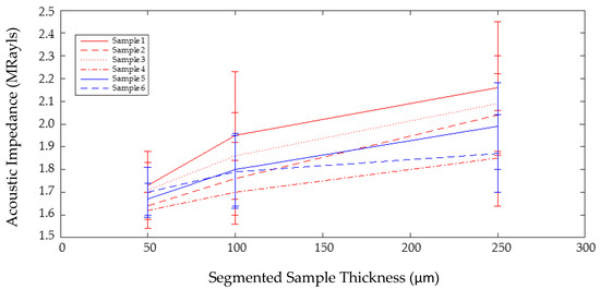 For all samples, Z and BSC were calculated for individual vertical lines then the average and standard deviation for all lines was calculated for each sample. The variation in Z across the six samples and the different segmentation depths can be seen in Figure 4 and the BSC intersample variance is shown in Figure 5.