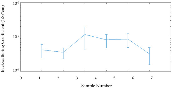 Backscattering coefficients for each digitally segmented tissue sample as a function of sample. Error bars show standard deviation across the full 30 mm of each scan.