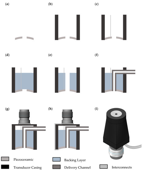 (a) Piezoceramic material was placed face down on a flat glass surface. (b) An additively-manufactured casing was placed over the piezoceramic material, ensuring they were coaxial. (c) Electrical interconnect was attached to the rear surface of the piezoceramic using Ag-loaded epoxy. (d) Glass microbubble-loaded epoxy was added to the rear surface of the piezoceramic and cured in an oven for 15 min at 70 °C. (e) A hole was drilled through the backing layer a 1 mm dia. drill bit. (f) The delivery channel was run through the central hole in the piezoceramic and out an outlet in the side of the casing. (g) The central pin on the surface mount SMA connector was attached to the electrical interconnect on the rear surface of the transducer using Ag-loaded epoxy. The SMA connector fit into grooves in the additively-manufactured casing and was secured using epoxy. (h) The electrical ground connection was attached from the outside of the SMA connector to the front face of the piezoceramic material using Ag-loaded epoxy. The ground connection runs along the outside of the transducer casing. Gaps in the transducer were sealed with epoxy to waterproof the transducer. (i) CAD model of the fully fabricated transducer showing piezoceramic, delivery channel, casing and SMA connector.