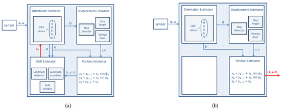 Proposed enhanced inertial pocket navigation system by including the landmark-based drift compensation algorithms in two steps: (a) first the drift value is computed and (b) second this value is used by the orientation estimator to generate a drift compensated trajectory.