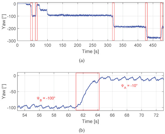 The proposed algorithm identifies the corners, defined in this work as 90 turns, using the yaw angle estimation. Figure 2a shows in blue the yaw angle estimation derived when the inertial sensors are placed in the front pocket of the trousers. Initially, the pedestrian was standing for almost 25 . If the pedestrian walks straight, the yaw angle estimation is stable. The oscillation zoomed in Figure 2b corresponds to the movement of the hip of the pedestrian while walking. When the pedestrian turns around a corner, the yaw angle estimation changes suddenly from the previous heading to the new one . The corner detector algorithm identifies these periods when the stability changes. The red rectangles highlight the yaw angle estimation during the detected corners corresponding to 90 turns, which are identified by the corner detector. Between second 75 and 100, two consecutive 45 turns are made, but these are not considered by the corner detector algorithm.