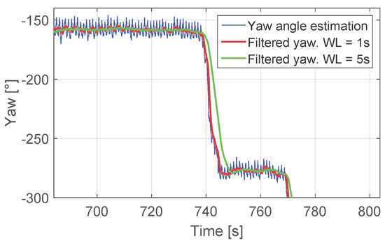 As Figure 3 shows, the yaw angle estimation contains peaks of approximately 20 amplitude for a comfortable walking speed. These peaks do not affect the corner detection, but the values and . The window length of the buffer q has been set to 1 in order not to delay the corner detection. However, as seen in the figure, a window length of 5 offers a more stable filtered yaw angle.