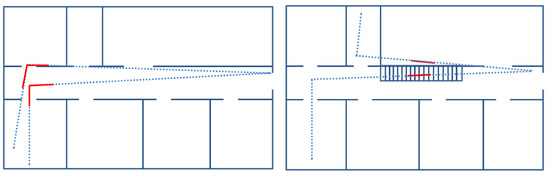 The drift computation algorithm for corners and stairs is based on the principle that having zero drift, the yaw angle values of associated landmarks are equal. Figure 5 (left) shows a schematic drifted trajectory represented with the dashed blue line. The pedestrian left the room, walked to the main entrance and went back to the same room. A corner, highlighted in red, is detected when leaving and entering the room. These corners are identified as the same landmark. Figure 5 (right) shows a schematic 3D drifted trajectory represented with the dashed blue line. In the represented walk, the pedestrian left the first room, climbed up the stairs to the second floor and then climbed down the stairs and entered the small room on the other side of the building. The stairs, highlighted in red, are detected when going up and down. Both parts of the trajectory described on the stairs will be associated as the same landmark.
