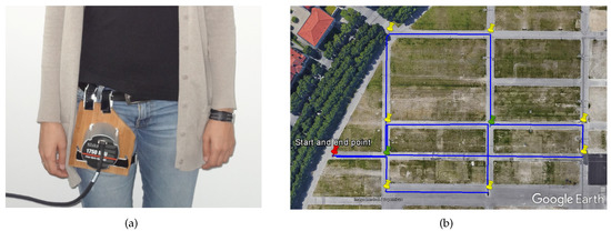 The IMU DSP-1750 has been mounted externally on the upper part of the leg of the pedestrian with the help of a solid wood base, as indicated in Figure 8a. The experiment, whose trajectory is represented in Figure 8b with a blue line, has a duration of 22 , consists of a path of approximately 1.1 long and has been performed covering an area of approximately 46,000 m at the Theresienhöhe in Munich.