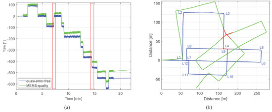 (a) represents the yaw angle estimation and (b) the trajectory of the walk corresponding to this experiment. The blue curves have been computed using the quasi-error-free turn rate measurements and the green curves have been computed with the MEMS-quality turn rate measurements. The corners are labeled.