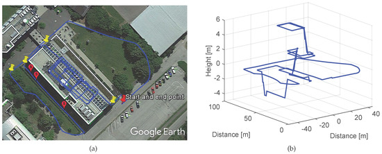 (a) shows the trajectory computed with the quasi-error-free measurements. The red pin highlights the start and end point, the yellow pins the detected outdoor corners and the pink placemarks the detected outdoor stairs. (b) shows the three dimensional view of the computed trajectory.