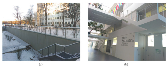 (a) shows the three outdoor stairs of the building and (b) shows the two indoor stairs.