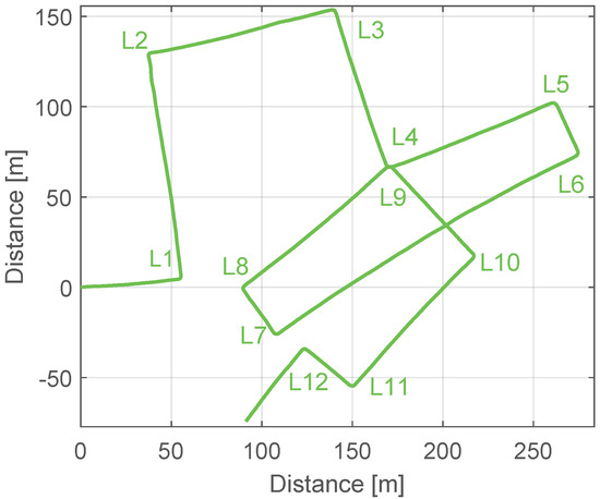 The main difficulty of computing the drift is to detect a correct yaw angle for the landmarks. Since the sensor is located on the pedestrian’s upper part of the leg, the resulting yaw angle reflects oscillations due to the movement of the hip while walking, which have an amplitude of up to 20. Additionally, the natural walk does not describe exactly the same angle when re-visiting an area, even if the walkable areas are restricted in manmade scenarios. As Table 8 shows, all detected associations yield to similar drift values. The fact that the correct associations, marked in bold, and the wrong associations yield to similar drift values is due to the architecture of the manmade area visited for the walk (see Figure 8), because the allowed walkable directions are restricted to North-South and East-West.
