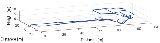 Next, we show a second experiment recorded with the IMU DSP-1750 with the set up previously described and shown in Figure 8a. The trajectory has been computed integrating the quasi-error-free turn rate measurements without subtracting the biases or applying updates, and the step detector, step length estimator and vertical displacement estimator proposed in [18,19]. The trajectory might contain errors due to these aforementioned algorithms e.g., errors in the step length or vertical displacement estimation. Nevertheless, the algorithms proposed in this work should work in the presence of these errors and in the presence of drift. The trajectory depicted in Figure 10 includes corners of small and large curvature radii and also stairs out- and inside the Earth Observation Center building of DLR.