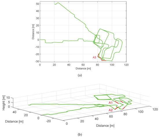The stairs connecting the first floor and the second floor, A1, and the stairs connecting the ground floor and the first floor, A2, highlighted in red in Figure 14b have been successfully associated, even though the stairs are in some cases detected in two sections due to the landing zone. Last, one corner on the ground floor at the beginning of the stairs, A3, highlighted in red in Figure 14a has also been associated. The loops described on the third floor lead to two possible corner associations, however, these are automatically disregarded because the time between landmarks is not significant to accumulate drift. Table 9 summarizes the deviation angles , the time between associated landmarks and the drift values computed by the proposed algorithm.