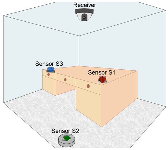 Wireless Sensor Network implementation using Optical Camera Communication (OCC) in an office (3 × 3 × 3 m3). The receiver is a dome camera installed in the ceiling (height 3.00 m) with 90° Field of View (FOV). The sensor’s emitters are LED matrices (60 × 60 mm2). Two sensors are located on the desk (height 0.80 m) and one sensor is over an autonomous robotic vacuum cleaner (height 0.10 m).