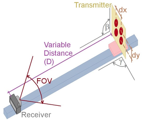 As shown in Figure 2, D is the distance between transmitter and receiver, and are the horizontal and vertical distances between the sources respectively, is the angle of the emitter-receiver vertical plane intersecting the emitter’s normal plane, and is the angle of the emitter-receiver horizontal plane intersecting the transmitter’s normal plane. Finally, depends only on the receiver characteristics and relates the Field of View (FOV) and the resolution in pixels () of the selected camera.