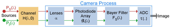 For determining the optical interference, the relation between the pixels from the link transmission source and the pixels from one close emitter within the corresponding channel (related with the selected wavelength) was deduced. The communication system has two main blocks: the channel and the camera process, as can be observed in Figure 3, where is the transmitted optical power spectrum; is the channel gain; is a geometric correction factor for each light ray depending on how it fell on the lenses; is the photodiode Silicon Responsivity; is the camera’s Bayer Filter response over the channel of the source S; is a nonlinear transformation due to the possible saturation from the analog/digital converter; and the image is the formed frame including all the sources.