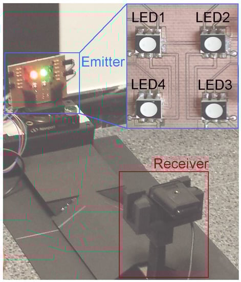 The receiver was a commercial USB webcam with 640 × 480 pixels resolution and diagonal FOV of 78°, which was controlled by a script for capturing frames with all the possible interference combinations, so the same parameters of image capture were assured. The camera was located on a rail in order to guarantee the alignment with the transmitter when the distance between the elements varied.