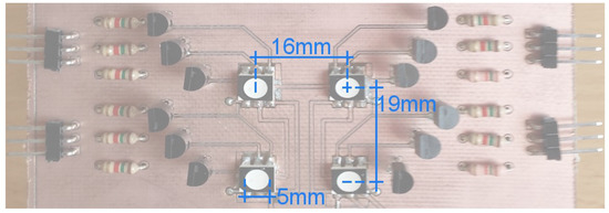 The board shown in Figure 5 was used as the emitter; the four RGB LEDs were circular (radius of 5 mm) with viewing angle of 120°, separated horizontally 16 mm and vertically 19 mm. These LEDs were switched ON/OFF using bipolar transistors and a small single board computer programmed with Python. In order to have all possible combinations, each LED was controlled independently, changing its colors with four possible outcomes: red, green, blue and white.