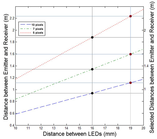 Distance between emitter and receiver for achieving a specific number of pixels (10, 7 and 5 pixels) in function of the LED separation. The distances of 0.016 m (black dots) and 0.019 m (red dots) represent the horizontal and vertical separation of the RGB LEDs in the testbed board respectively. The values in the right were the selected ones for each specific pixel number.