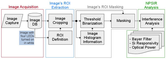 As shown in Figure 7, the experiment had four phases: Image Acquisition; Image’s Region of Interest (ROI) extraction; Image’s ROI Masking; and NPSIR Analysis. For this purpose, the board was programmed to turn on the LEDs for each color: blue, green, red and white (the three orthogonal colors at the same time) following the sequence: