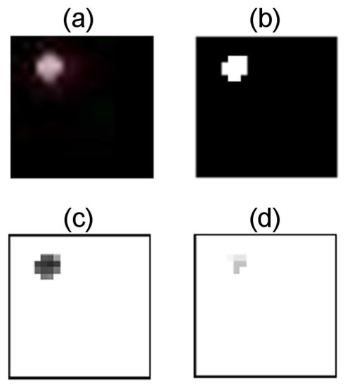 Cropped Image Process. (a) ROI of the image with LED1 turned on in red color; the distance between emitter and receiver was set to 100 cm; (b) Binary mask obtained with threshold 0.3431; (c) Non-zero pixels of the emitting LED’s image, obtained from applying the mask to channel R of the image; (d) Non-zero pixels of the interference signal from LED2 turned on in white color, obtained from applying the mask to channel R of the interference image.