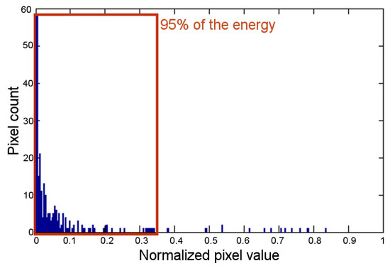Then, this fragment of the original image was processed in order to obtain a binary mask similar to the image in Figure 8b. For this purpose, a dynamic threshold, that assured the conservation of 95% of the energy, was calculated from the corresponding image’s histogram in the specific channel (R, G, or B) of the emitter. The Figure 9 shows the histogram of the previous example image over channel R, where the threshold was measured as 0.3431. Finally, the pixels from the transmitting LED () were determined by applying the obtained mask to the appropriate channel of the cropped image that contains the emitter LED (see Figure 8c). In the same way, the pixels from the close by interference LED () were calculated by masking the image that contains the next horizontal or vertical LED (Figure 8d).