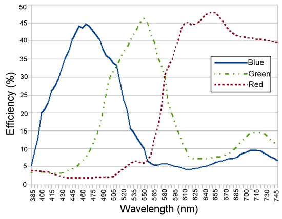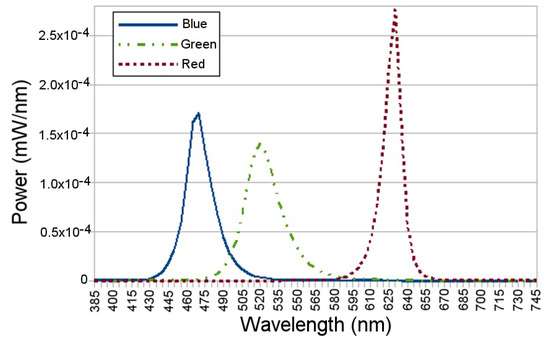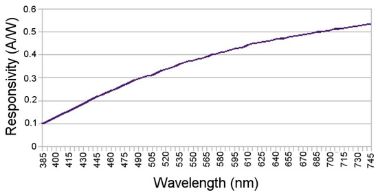 In order to calculate the NPSIR, as shown in Equation (4), pixel count was executed in conjunction with the optical power, the Silicon responsivity, and the Bayer Filter response. Using an optical spectrum analyzer, the optical power emitted by each LED of the board in each color was obtained; Figure 10 shows the particular case of LED1 (top left in Figure 4) turned on in the different colors. Theoretical Bayer Filter response (Figure 11) and silicon responsivity (Figure 12) of the selected camera were obtained from the sensor data sheet [18,19]. Since the data of the optical power were determined by sampling wavelengths from 385 nm to 745 nm with steps of 5 nm; the NPSIR was calculated using a numerical integration of Equation (4), yielding as shown in Equation (5).