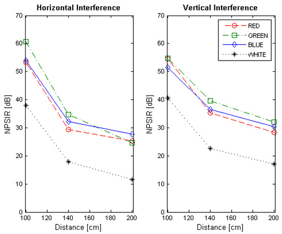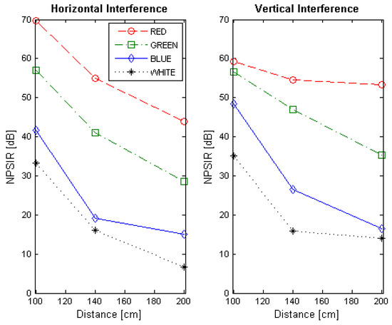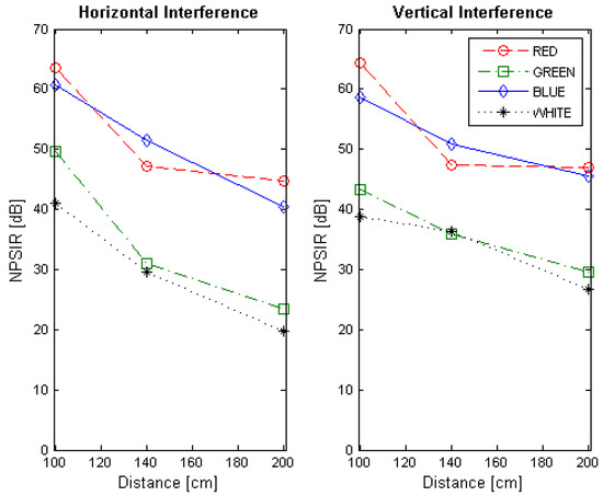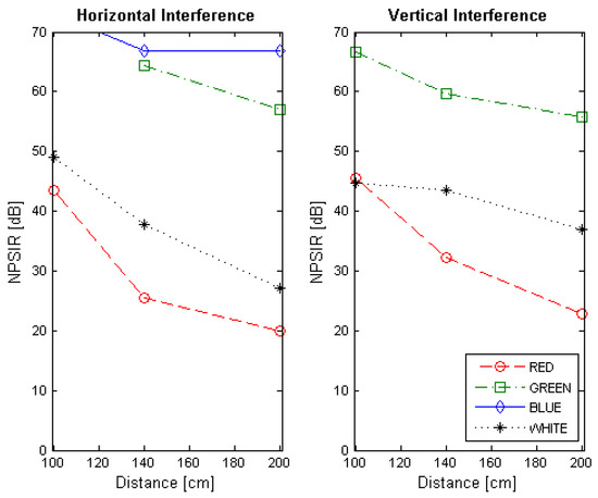At the end of the optical interference experiment, the NPSIR for each selected distance, color combination and LED position was calculated. Figure 13, Figure 14, Figure 15 and Figure 16 shows the obtained results transmitting in Blue, Green, Red, and White respectively, in function of the distance between transmitter and receiver. In all the figures, the left plot corresponds to the interference from a LED on the same horizontal line of the transmitter, whilst the right chart presents the interference from a source in the same vertical line. For example, if the emitter is LED1, the horizontal interference came from LED2 and LED4 contributed to the vertical one (see Figure 4). The line color represents the wavelength of the interference, except for the black line that shows the interference from the LED turned on in white.