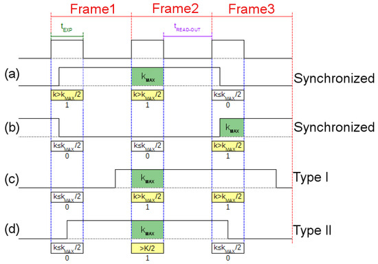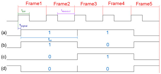 Synchronizing procedure. (a) The average pixel value of the second frame is , therefore the first two frames are decoded as “1” () and the third is decoded as “0” (), so the signal is synchronized with the camera and no process is needed. (b) The average pixel value of the third frame is , therefore the first two frames are decoded as “0” () and the third is decoded as “1” (), so the signal is synchronized with the camera as in case (a). (c) The average pixel value of the second frame is , therefore the first frame is decoded as “0” () and the other ones are decoded as “1” (), so the signal is not synchronized with the camera and type I process is needed; the first frame is discarded in order to synchronize the signal. (d) The average pixel value of the second frame is , therefore the first and third frames are decoded as “0” () and the second is decoded as “1” (), so the signal is not synchronized with the camera and type II process is needed; the emitter restart the transmission.