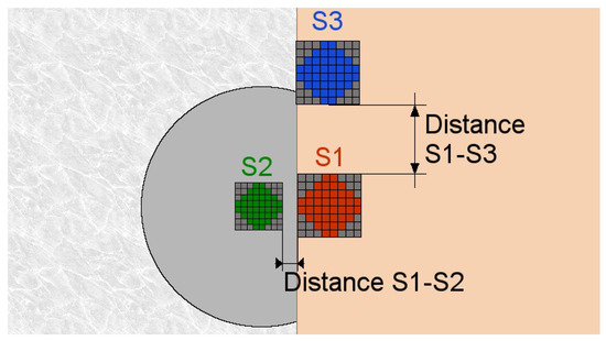 Another simulation was also held. In this case, for each projected distance, the corresponding pixels SIR () was calculated using Equation (4) with the NPSIR values obtained in the previous experiment and the parameters of the simulated camera and emitters. Finally, the BER was calculated in function of the SIR. As shown in Figure 19, the sensors on the table (S1 and S3) had a wider disk representation than the sensor over the autonomous robot (S2) due to the height’s difference.