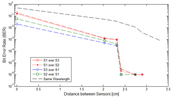 The simulated scenario also shows that the deployment of this system is feasible. Using OOK-NRZ modulation there is no significant BER produced by close emitters when the sensors are separated more than 4.50 cm (zero for the Monte Carlo simulation and less than 2.85 × 10−15 for the NPSIR one), and the maximum BER of 1.3 × 10−3 from the Monte Carlo simulation (5.44 × 10−4 from the NPSIR simulation), obtained for 2.00cm separation, predicts that the communication link will work properly under real conditions.