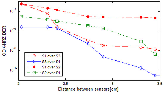 Monte Carlo Simulation. Bite Error Rate in function of the separation between sensors. The sensors transmitted On-Off Keying (OOK)-NRZ . signals in Red (S1), Green (S2) and Blue (S3).