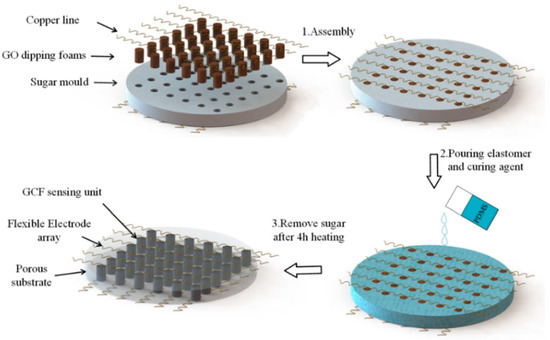 The sugar mould was fabricated by mixing fine granulated sugar and water at a ratio of 35:1, and directly followed by a drying procedure in an air-circulating oven at 90 °C for 30 min. We tried various granulated sugars with different granularity, such as coarse sugar, sanding sugar, and regular white sugar. In addition to these large crystal sugars, castor sugar with ultrafine granularity is ideal for sugar template formulation since it dissolves easily and smooth crystal could be more homogeneous. This is probably due to the fact that the size of the sugar particles in the templates were notably different [16]. Furthermore, the homogeneous and compact sugar mould can withstand reasonable handling and machining without collapse; the 6 × 6 through-hole array can be formed by drill-hole directly. The manufacturing procedure of the PDMS matrix is demonstrated in Figure 1, and the sugar, with ultrafine granularity, was used to form the sacrificial template with a well-connected microporous. The production of GCF was performed through the simple solution dip-coating of GO on the commercial polyurethane (PU) sponges (3M Company, St. Paul, MN, USA). The GO aqueous solution of 4 mg/mL was purchased from Graphenea Inc (San Sebastián, Spain). The tailored PU sponges were first dip-coated in the GO suspension by a repetitive squeezing, and then placed in the through-hole array of the sugar template; the GO was reduced finally by the step mentioned below, at 120 °C for 4 h. The reduction process could induce the self-assembly of the reduced graphene oxide (rGO) sheets, and lead to the formation of the graphene-coated structure in GCF. By using the direct template method, we have performed a package of the prepared copper wires and GO/foams in this procedure. The liquid PDMS (Sylgard 184, Dow Corning (China) Holding Ltd., Beijing, China) was prepared by mixing the base elastomer and curing agent at a 10:1 weight ratio. The obtained porous substrate with this ratio can possess a relatively higher strength and durability, as previously reported [17]. After pouring it straightly into the culture dishes and being immersed with the above integrated products, it was placed in a vacuum oven about 45 min, to fully exhaust the air bubbles; subsequently, it was heated at 120 °C for 4 h to solidify the mixture. Then, the resultant was soaked in water for 1 h to dissolve the sugar particles in water. After drying for another hour, the nested graphene-coated foam became the inner packaged sensor element, and the flexible electrode became consistent with the surface layer, which led to the formation of the flexible sensitive sensor array. For the other, the graphene-assembled monoliths (GM) were also prepared for the comparison of surface appearance that followed. 500 μL GO solution was added in a micro test tube, and was reduced at 120 °C for 4 h in sealed state. Then, the resultant was directly dried in an air-circulating oven at 90 °C. During the drying process, the evaporation of water led to the self-assembly of GO sheets, resulting in the formation of a graphene monolith.