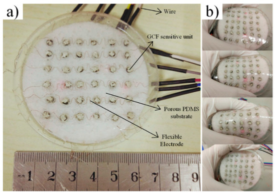 The schematic of the fabrication process of the sensor array is demonstrated in Figure 1. The fabrication includes the following three facile steps: (1) assembling the cylindrical graphene oxide (GO)/foams into the holes of the sugar mould and attaching the copper lines into its surface; (2) pouring the liquid polymer in the sugar template (as a two-part polymer, base elastomer and curing agent (PDMS) is used); (3) Curing the base material and reducing the GO dipping element in a single heat step, and taking off the sugar by water dissolving. The hierarchical structure of the pressure-sensitive array consists of the upper electrodes, the pressure sensitive GCF, the insulating porous substrate, and the bottom electrodes. First, the upper and bottom electrodes are soft, and the flexible copper wires are attachable to the surface of the base material. Second, the curved shape is obtained by manually twisting, and the contact area of the sensor elements is consolidated using low temperature silver paste. Moreover, there are corresponding through-holes in the sugar mould, to locate and fix the sensing units. The number and size of through-holes have matched the cylindrical GCF. In addition, the insulating porous substrate guarantees that the large deformation of the sensing elements is in accordance with the whole package device. In the horizontal plane, the bottom and upper electrode arrays are placed orthogonally, and this spread electron array and horizontal-to-vertical configuration maintain a large proportion of the active sensing area. Furthermore, the thickness of the electrodes and pressure sensitivity rubber is 0.1 mm and 4 mm, respectively. The thickness of the total pressure-sensitive array is 10 mm, and the radius is 35 mm, as demonstrated in Figure 2a.
