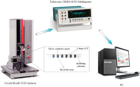 The piezo-resistive characteristic has been researched with a GCF sample (4 mm diameter and 2 mm height). Electrical conductivity was measured using a two-point probe method. An instron (Zwick/Roell z010, Zwick, Ulm, Germany) that uses a strain control mode with a compressive strain rate of 100% min−1 was used to provide the required pressure. Furthermore, a digital multimeter (Tektronix DMM 4050, Tektronix, Shanghai, China) was used to monitor the resistance change of the GCF, which is described in Figure 3. Moreover, the microstructure and morphology was observed by a FEI Quanta 200 (FEI, Hillsboro, OR, USA) Scanning Electron Microscope (SEM) at 20 kV.