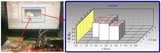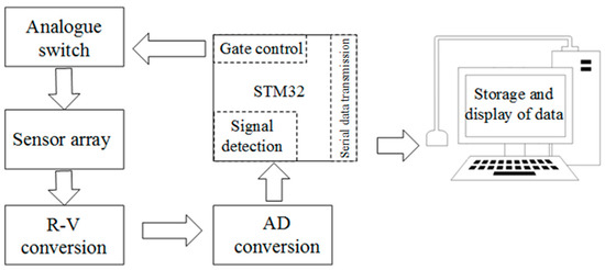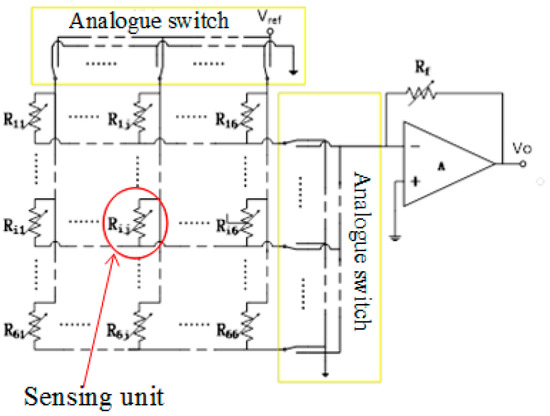 The arrangement of GCF is assembled as a two-dimensional (2D) resistive sensor array to reduce the crosstalk problem [18]. The electrical connection of electrode array utilized the shared row and column connections to simplify the electric connect complexity. All the row-column nodes can be regarded as 36 individual sugar pressure sensing units, as demonstrated in Figure 4. The detection orders of the sensing array are controlled by the four-channel and double-throw analog switches, with the combinations of rows and columns, the scanning module, and the voltage feedback to determine whether the sensing units is pressured or not. We can scan the whole array by switching these analog multiplexers, which are digitally-controlled by the STM32 microcontroller. The microcontroller is controlled only by one independent sensor in the power supply at a time, and its detectable resistance change will be readout sequentially. In addition, Figure 5 exhibits the schematic of the sensing systems. The readout resistance signal could be obtained and converted into the voltage signal on the reference resistance of Rf by the R-V conversion circuit. Straight after the analog-to-digital (AD) conversion, the digital voltage signals are sent to PC through the serial port. The further storage and display of the data in real-time can be carried out by the PC software.