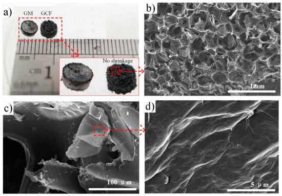(a) Macro photo of the mini size of graphene-coated foams (GCF) and graphene-assembled monoliths (GM) that are synthesized by the same process. The insert that demonstrates GCF can be fabricated with a small size and the well-defined appearance of geometries; (b–d) show the Scanning Electron Micrscope (SEM) images of GCF under some different resolutions.
