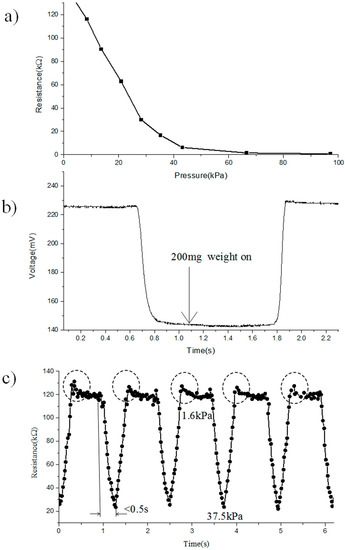 Figure 7a demonstrates the relationship between the electrical resistance of the sensing unit and the applied loading. When the external forces that are applied on the sensor array have increased from 0 to 95 kPa, the resistance of the sensing units becomes smaller gradually, and as a result, changes from 121.9 kΩ to 56 Ω, as shown in Figure 7a. We have cycled that process several times on each sensing unit, and took the average of these negative pressure coefficient of resistances. Furthermore, Figure 7b indicates an example of the sensor array, detecting the low weight (200 mg weight on an area of 12.56 mm2 is equivalent to 1.6 kPa). The pressure sensitivity of GCF is 51 mV/kPa, which is superior to the previously reported rGO sensor array(19 mV/kPa) [12], MEMS sensors (37.5 mV/kPa) [20], and carbon nanotubes (CNT)-based sensor (10 mV/kPa) [5]. Figure 7c shows the robustness and recyclability of the pressure-sensitive array. The sensing unit has demonstrated a constant response time when increasing applied loading from 1.6 kPa to 37.5 kpa. The general response time is less than 0.5 s, which is much faster than the reported sensor array, which has been encapsulated into the rigid PDMS substrate [11]. When the applied loading has releases quickly, it also indicates a similar trend across the unloading process. Moreover, there is a smaller pulse resistance than the commercial conductive rubber [11], just as circled in Figure 7c. The reason for the unique property is the fast relaxation deformation process of the sensor array, which has combined both the robust porous substrate encapsulation and high sensitivity porous material. In practice, with its stress-dependent resistance to detect the loading force reversibly, and the combination of the porous sensing elements and substrate, as well as the low delay, all these have indicated the possible application of real-time force detection with high sensitivity.