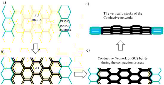 The piezo-resistive mechanism is in the composite: (a) interconnected network of the polyurethane (PU) matrix; (b) initial conductive paths are being built, owing to the graphene sheets coating; (c) the resistance of the conductive path has been enhanced, due to the increased density of graphene sheets; (d) the stacks of the conductive path until the compression limit.
