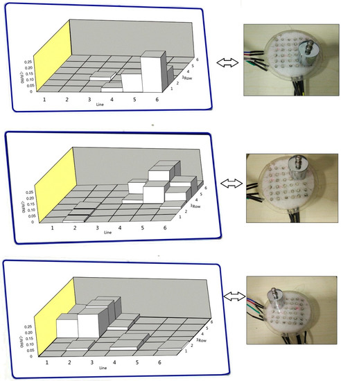 For tactile sensing and human-computer interfaces, the pressure sensor array needs to be developed to detect pressure distribution. The position of the weight could be identified by testing their conductivity changes in our sensing system. Figure 9 shows simple tests, realized by placing different positions of the weight to detect pressure distribution. The area of each sensing unit is 12.5 mm2. The 100 g cylindrical standard weight was used to provide applied loading in the testing. Output voltages of the sensing elements can be transferred to computer software for analysis. The position obtained from the pressure sensor array is consistent with the positions. Figure 10 demonstrates a pressure test to observe the response of the sensor array under the compress strain. Quasi-static pressure is applied by using the thumb to manually press the sensor array surface. The prominence thumb presses three sensing units, and then the side of the thumb contacts the other four elements until the equilibrium conditions appear. The response reveals a good spatial localization that is presented as a three-dimensional histogram, which also conforms to the application of the Quasi-static pressure area on the array. Meanwhile, the column height (the value marked in red) is used to display the resistance change (ΔR/R0) values. In accordance with the relationships between the resistance and applied loading, the amount of pressure can be visually recognized as well. Besides, the data disparity of the column height can explain the inhomogeneous contact force on the array surface, because the thumb prominence is spherical. Owing to the high spatial resolution and sensitivity of the 6 × 6 sensor array, it is very easy to exactly define the place of the applied pressure and its degree. Additionally, the uncertainty of the large sensor array commonly results from crosstalk effect, and instrumental bias errors were also observed. In order to assess these errors, a number of readings (n = 10 times) are performed for each sensing position. The measurement errors that occur in actual sensor data reveal a strong positive correlation with increased external loading, as shown in Table 1. The subscript of Sij is in accordance with the Rij in Figure 5, and we take regional dates in S11–S33 as typical to avoid lengthy data. The maximum deviation is less than 10%; also indicated is good repeatability and compatibility between the sensing units and porous substrate at the core sensing regions.