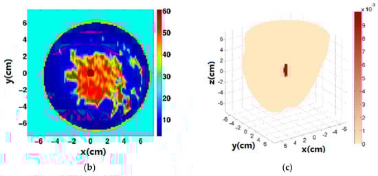 Fear et al. [] investigated a TSAR prototype for identifying breast cancer cells (Figure 3). To reduce image noises, the skin reflections were removed from the measured scattered electric field. Clinical results showed that TSAR has an ability to detect and localize lesions with sizes greater than 4 mm in diameter. TSAR has some limitations such as the large reflections caused by the skin and expensive electronics for real-time imaging. To solve these problems, a Bayesian estimator was applied to enhance image resolution [].