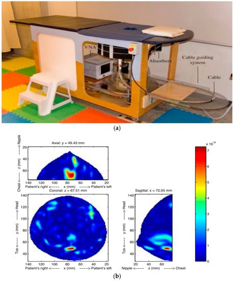 Recently, Porter et al. [] developed a wearable microwave radar prototype (see Figure 4) for imaging of breast tumors. This cost-effective wearable prototype was made of 16 flexible microwave sensors embedded into a bra. The prototype has been tested on human subjects. Experimental results confirmed that the proposed design has the potential to become a clinical prototype.
