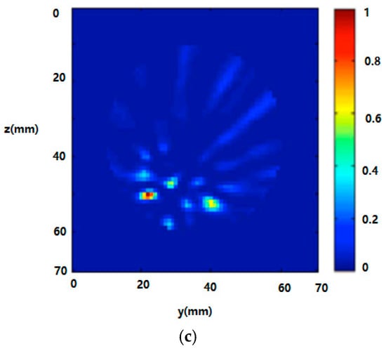 Hagness et al. [] developed a CMI approach for diagnosing breast cancer. Experimental results demonstrated that small tumors with sizes of 2 mm can be detected using the 2D CMI system, and tumors with a size of 6 mm in diameter can be detected using the 3D CMI system. CMI has the ability to generate high-resolution images, but has limited ability to discriminate against artefacts and noise. To overcome these challenges, a delay multiply-and-sum signal processing with CMI was developed to produce higher resolution images and high interference rejection capability.