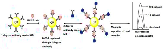 Figure 6 displays a quantum dot optical biosensor for diagnosing breast cancer cell (MCF-7). Quantum dots are labelled with primary antibodies against MCF-7 cell surface proteins and subjected to sample containing MCF-7cells. Addition of secondary antibody labelled magnetic beads enable their magnetic separation to obtain fluorescence emission spectra.