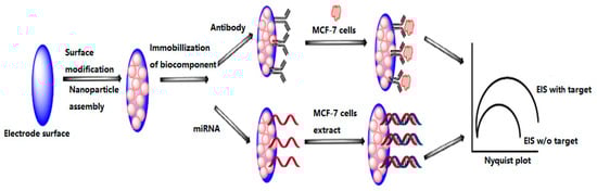 Electrochemical biosensors measure the changes of dielectric properties, dimension, shape and charge distribution while antibody–antigen complex is formed on the electrode surface, which have been widely used in medical and bioengineering fields. Various types of electrochemical biosensors have been developed to detect different types of biomolecules such as proteins, antigen, DNA, antibody and heavy metal ions. Previous studies showed that electrochemical sensors provide high sensitivity and specificity in buffer and serum samples []. Figure 7 shows the developed electrochemical biosensor for MCF-7 cells detection []. Antibodies against surface proteins of MCF-7 cells were immobilized on nanoparticle assembled electrode to capture MCF-7 cells at the electrode surface which increases the interfacial resistance and hence enlarged semicircle in Nyquist plot []. Alternatively, cDNA complementary to miRNA can also be immobilized to capture target miRNA released from the cell extracts of MCF-7 cells.