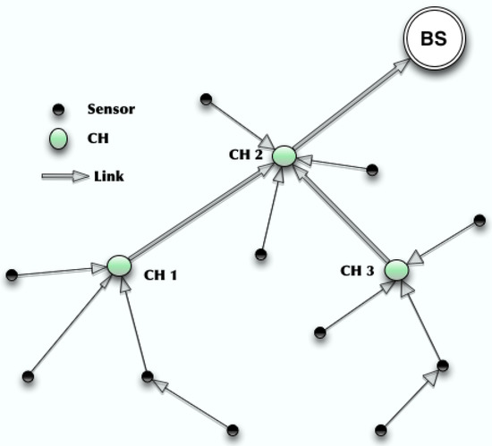 Wireless Sensor Networks (WSNs) are networks composed of distributed micro-devices embedded with various sensing abilities (called sensors), which are used to monitor the environment and send the information back to a central Base Station (BS) [1,2]. WSNs typically include a large number of sensors that are equipped with limited energy resources, but are required to operate without recharging or replacing batteries for extended periods of time. Energy efficient communication solutions for WSNs are highlighted by many researchers [3,4]. In order to prolong a networks longevity, clustering techniques have been introduced to achieve energy efficient communication between sensors. A clustering algorithm can partition sensors into different clusters/groups, as shown in Figure 1. In each cluster, a Cluster Header (CH) is elected to be in charge of generating a transmission schedule, gathering data from all the sensors in the cluster and transmitting the assembled data back to the BS. Based on the clustered structure, the system can maintain a longer life by scheduling the duty cycle between the sensors within a cluster, without harming the functionality of the network. In addition to saving energy from scheduling, a sensor can also reduce energy consumption from communication since it only needs to communicate with a local CH rather than a far located BS. Clustering techniques can decompose sensors within a WSN into different clusters. After joining a cluster, a sensor normally only needs to communicate with its own CH. A CH can communicate with the BS directly or through other CHs, as shown in Figure 1. The routing between the sensors in the same cluster is called intra-cluster routing. The routing between the CHs and the BS is called inter-cluster routing. The routing scheme can be either single hop or multihop, and is dependent upon several factors, such as the objectives of a clustering algorithm or the communication capability of the sensors.