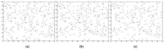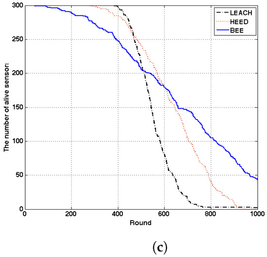 Sensor distribution after 450 rounds using LEACH, HEED and BEE. (a) LEACH; (b) HEED; (c) BEE.