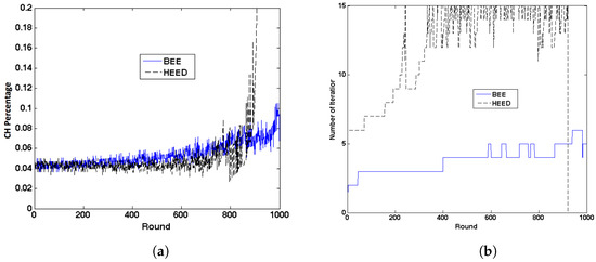 Comparison between HEED and BEE. (a) CH percentage; (b) The iterations required in each round; (c) Number of sensors still alive.