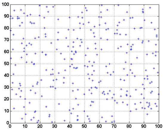 The cluster radius in both BEE and HEED is set to be 25 m. The sensing radius is set to be 10 m. To simplify our problem, we partition the network area into grids of the size 10 m × 10 m rather than circles. Through this way, the sensing field is partitioned into 100 cells. In each cell, if there is a sensor still alive, we assume this area can be monitored by system. To guarantee the network coverage, a clustering algorithm should be able to cover the cells maximally. Since the sensors are randomly deployed in the network, the initial coverage with 300 sensors is 93 cells, as shown in Figure 7. The coverage of the network after each round is shown in Figure 8.