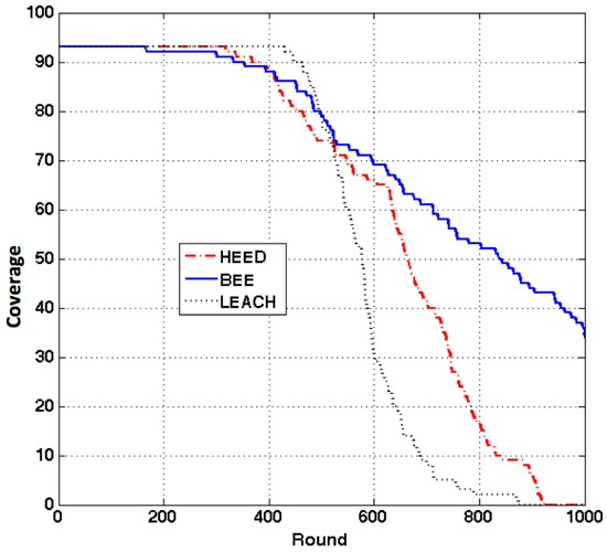 We can see from Figure 6c that nodes started to die around 100 round for BEE. However, in Figure 8, BEE started to lose coverage around 180 round. It means that the sensors started to die from 100 round till 180 round did not have any impact on the sensing coverage of the network. For long term, BEE can provide better coverage than HEED and LEACH.