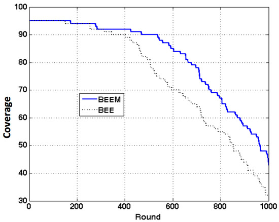 When evaluating a clustering algorithm, power consumption is normally the only concerned metric, to the detriment of other issues such as network coverage. Coverage sensitivity longevity has been proposed to evaluate network lifetime rather than number of nodes. Network coverage is determined by the distribution and sensing range of the sensors. Some of the sensors in the network are more important than the others in terms of network coverage. The sensors that do not have a significant impact on the coverage of the network are allowed to die sooner than the others. The experimental results for original BEE are shown below.